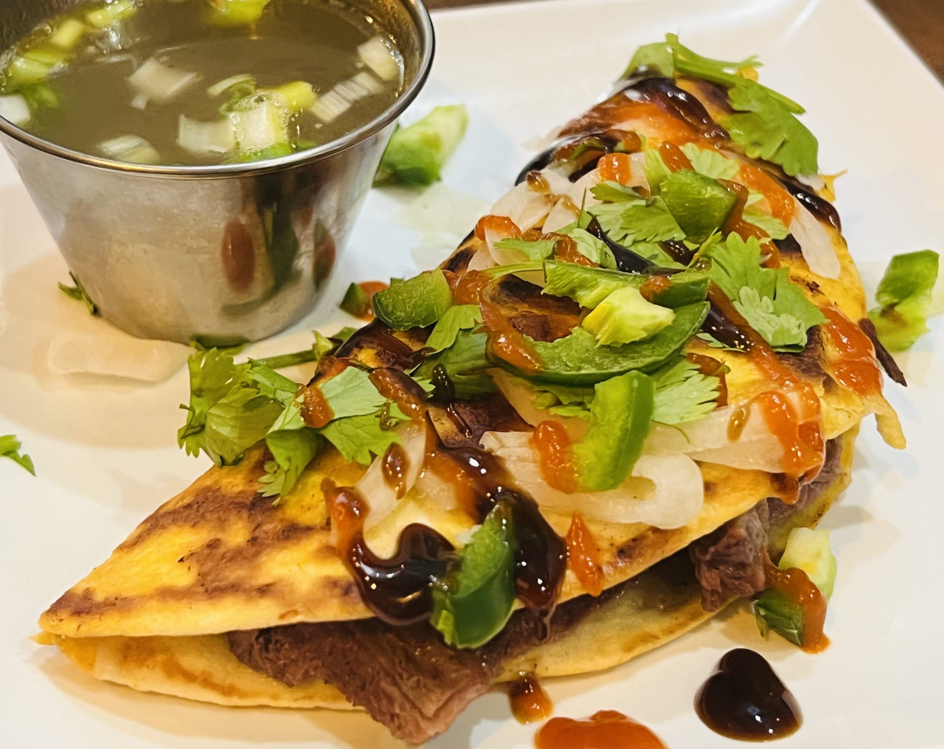 Braised beef with Vietnamese Pho spices, cheese, onions, cilantro, flour tortilla, served with a side of Pho broth.